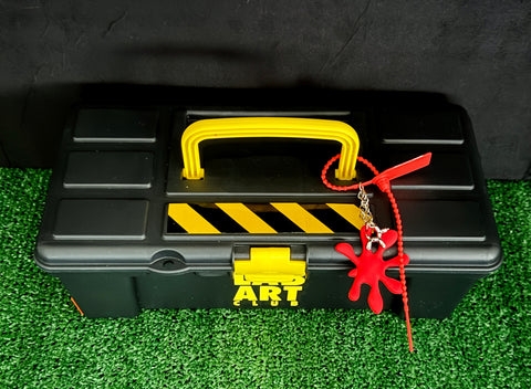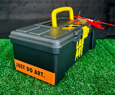 LAB ART CLUB LOGO ON THE FRONT & JUST DO ART LOGO ON THE SIDE. REFLECTIVE STICKER ON THE TOP OF THE BOX WITH SPLATTER KEYCHAIN ON ZIP TIE.
